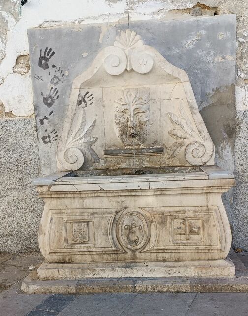 Fuente histórica del siglo XVII con pilastras toscanas y caños decorativos, ideal para admirar arquitectura renacentista y heráldica en un entorno histórico.